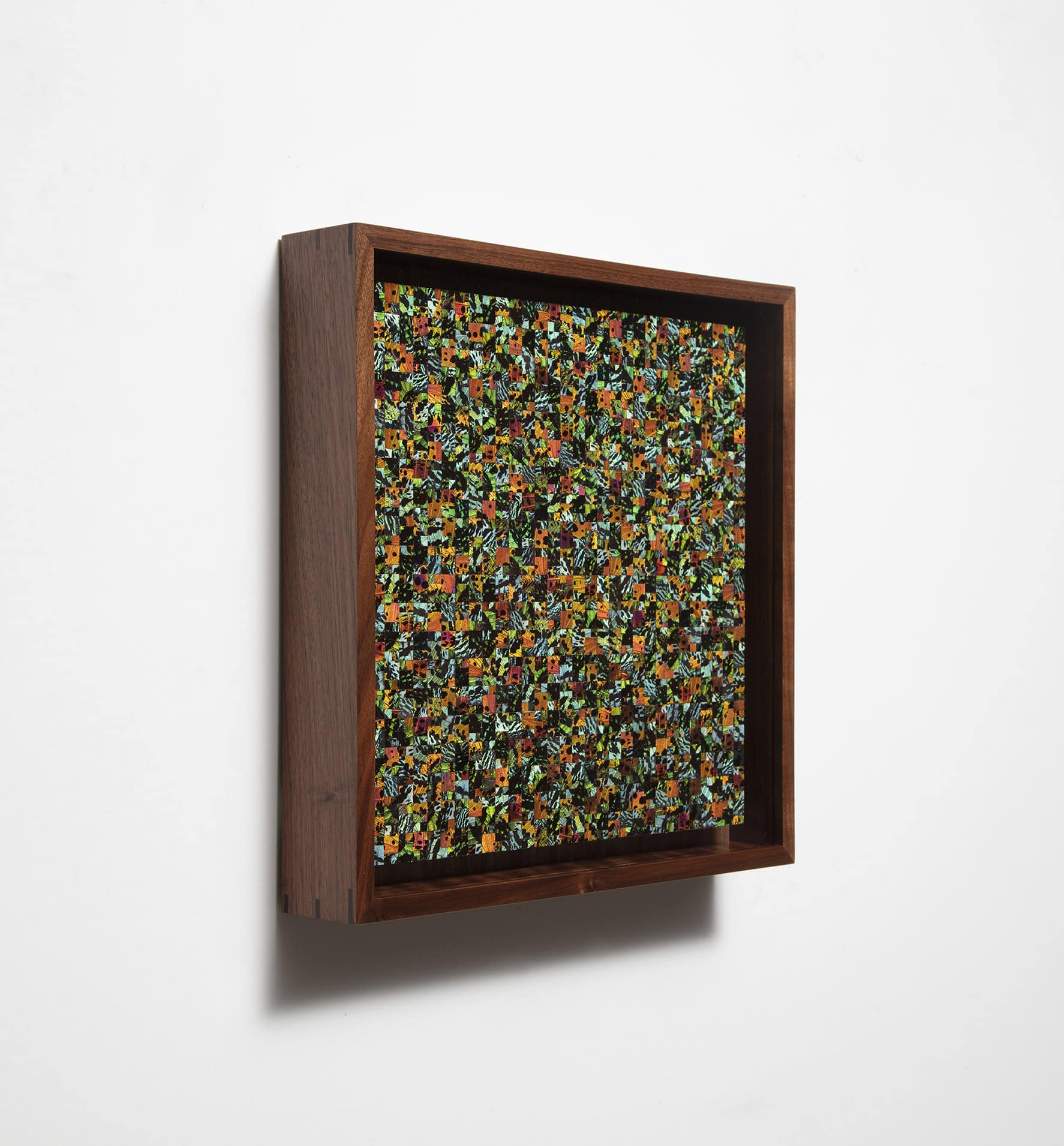 Gabriel de la Mora’s new Lepidoptera series composed of thirty-three works made of eight different species of butterflies, seem to complete a cycle of difference in which the artist merged modernist lessons by Joseph Albers with his own propensity to isolate fragments as compositional elements for transforming images into a scribbled discourse. If the Mexica mythologies added a cultural layer to De la Mora’s formal endeavor of bringing the opalescence of butterflies to abstract painting, their unnoticed beauty appealed as a language in which color always hides the nature of the element that you see. Mimicry is their “demon” or to put it in words by Roger Caillois: “it is not the presence of the elements what is perplexing and decisive, it is their mutual organization, their reciprocal topography.”[3]