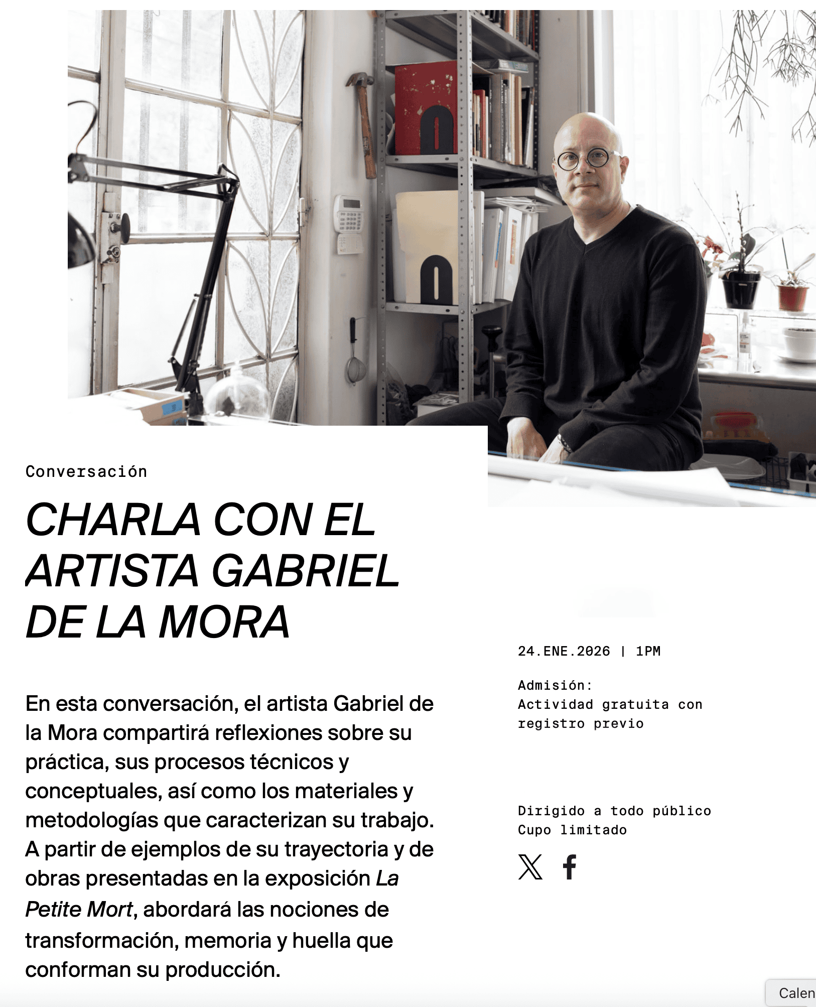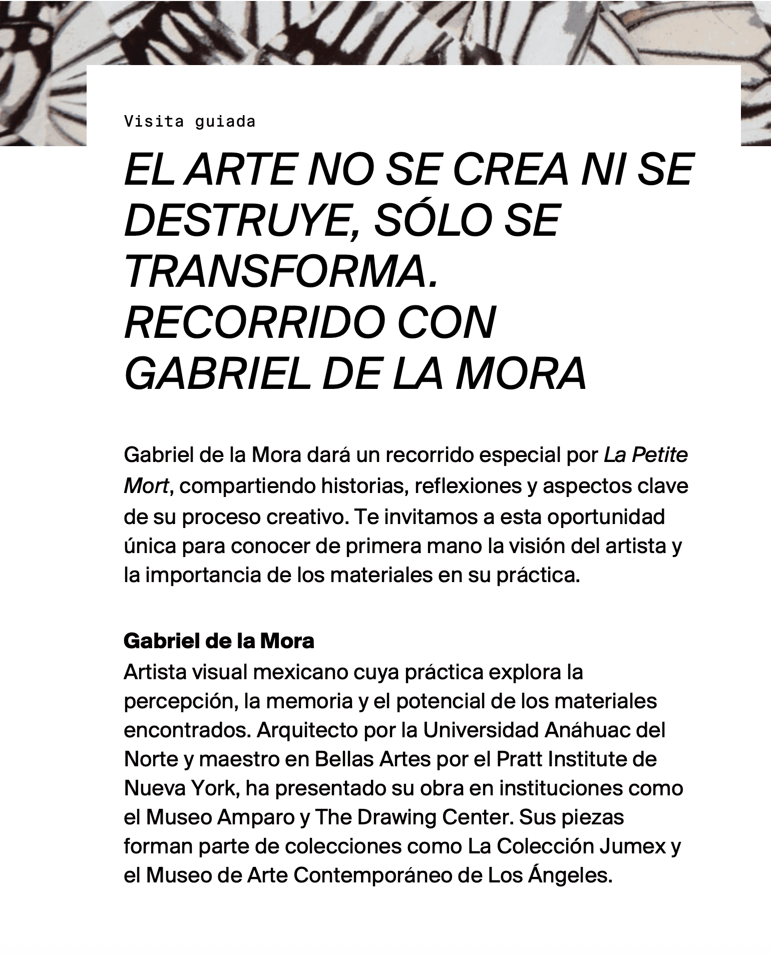 In this conversation, artist Gabriel de la Mora will share reflections on his artistic practice, exploring both the technical and conceptual processes, as well as the materials and methodologies that define his work. Drawing from key examples of his career and from works presented in the exhibition La Petite Mort, he will address the notions of transformation, memory, and trace that shape his production.