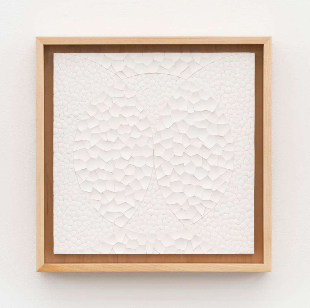 1,412 fragmentos convexos, 525 fragmentos de vidrio soplado y aluminio cóncavos sobre cartulina de museo y madera / 1,412 convex, 525 concave blown glass fragments an aluminum on museum cardboard and wood